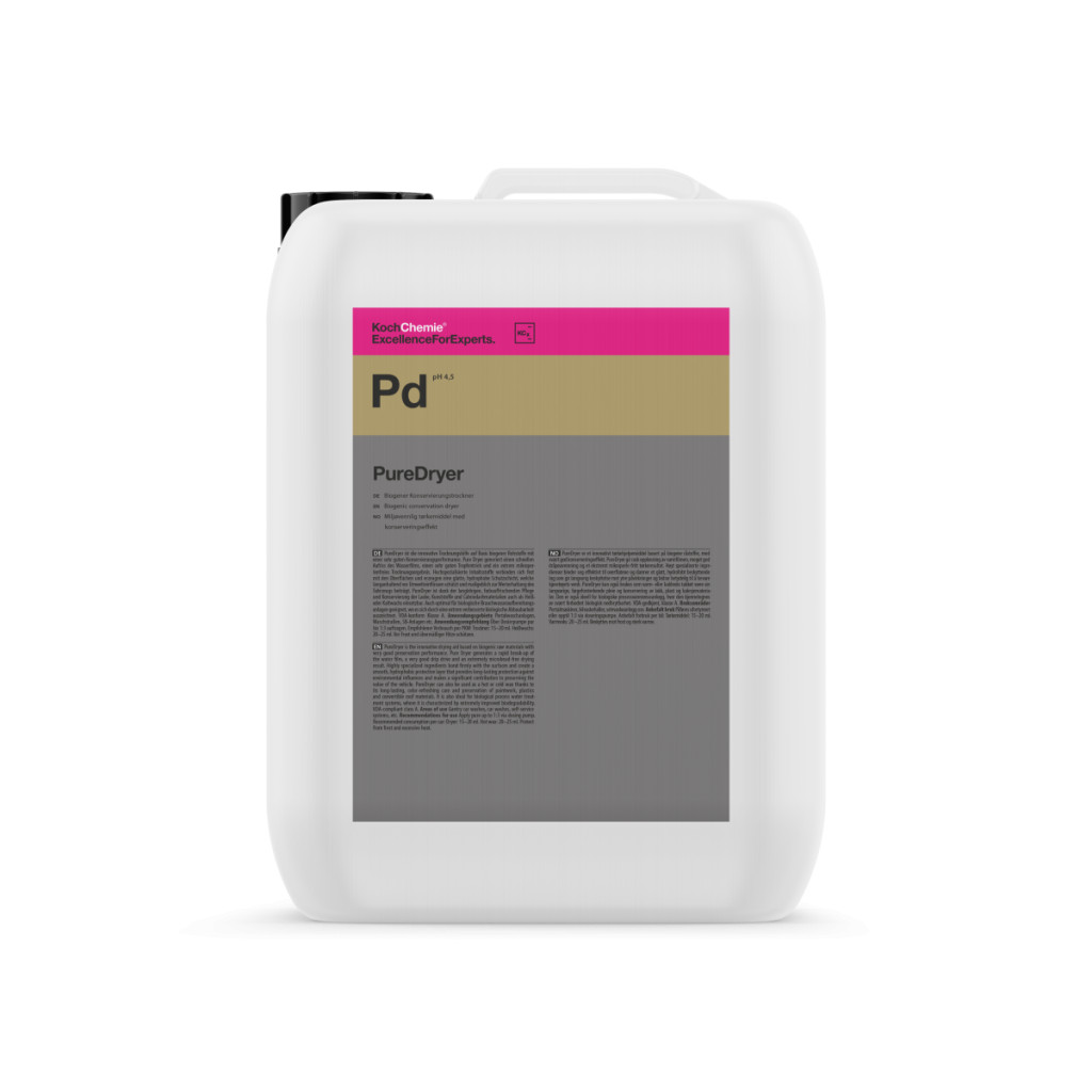 A PureDryer egy innovatív, biogén nyersanyagokon alapuló szárítási segédanyag, amely nagyon jó tartósítási teljesítményt nyújt. A Pure Dryer a vízfilm gyors felszakadását, nagyon jó csepegtetőhatást és rendkívül mikrogyöngymentes szárítási eredményt produkál. A magasan specializált összetevők szilárdan kötődnek a felületekhez, és sima, hidrofób védőréteget hoznak létre, amely tartós védelmet nyújt a környezeti hatásokkal szemben, és jelentősen hozzájárul a jármű értékének megőrzéséhez. A PureDryer meleg- vagy hidegviaszként is használható, köszönhetően a tartós, színfrissítő ápolásnak és a fényezés, a műanyagok és a kabriótető anyagainak megőrzésének. Ideális biológiai technológiai vízkezelő rendszerekhez is, ahol rendkívül javított biológiai lebonthatóság jellemzi. VDA-nak megfelelő A osztályú.